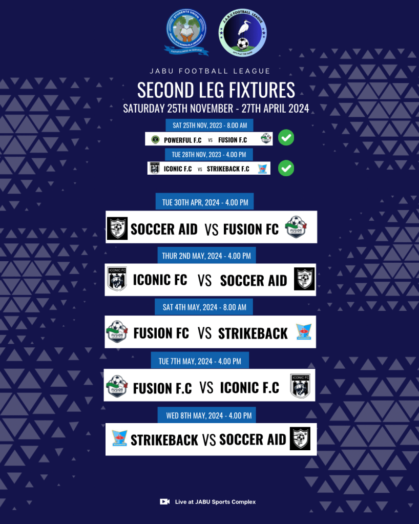 Irregularities found in the registration of players, amongst other issues that include but not limited to a clash between players of Powerful FC and a member of staff resulted in the Powerful FC team being disbanded, and the league suspended. After a series of meetings between the Students union, Students Affairs office and Management, the league has been approved to continue after the conclusion of the official registration of Fusion FC, Iconic FC, FC Strikeback and Soccer Aid FC under the Students Affairs office. This implies that the above listed teams now have an official and permanent membership in the league under the school’s administration, and can ensure continuity till further notice. The league resumes on Tuesday, April 30th and the fixtures are featured below.